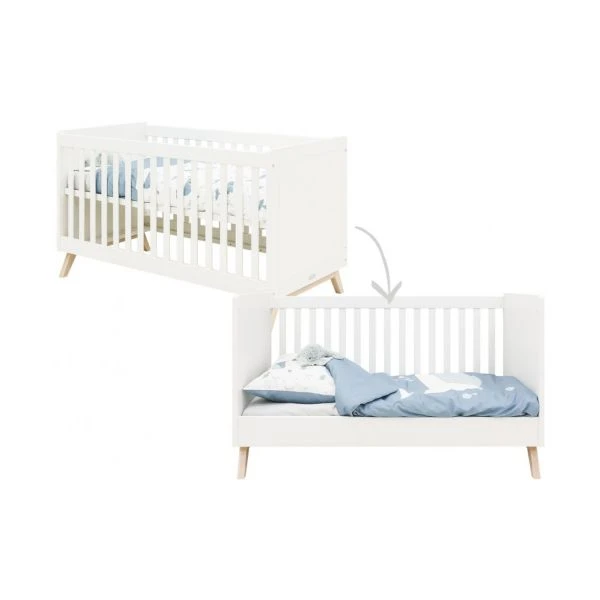 Het babybed uit de Fenna serie van Bopita kenmerkt zich aan de kleurencombinatie. De witte kleur met een blank beuken onderstel zorgt voor een unieke look in de babykamer. Door een ledikantzijde eruit te halen en er de meegeleverde losse planken er tussen te monteren krijg je eenvoudig de mooie bedbank. De bedbodem is verstelbaar in hoogte waardoor het extra veiligheid biedt. Het is vervaardigd van kwalitatief MDF wat is gecombineerd met beukenhout.