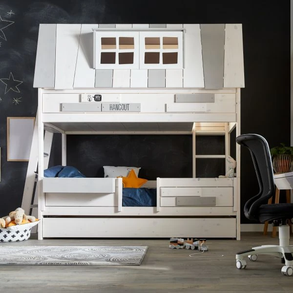 Vanaf het benedenbed kun je via een kleine trap naar de stoere hangout om daar je spannende avonturen te gaan beleven.