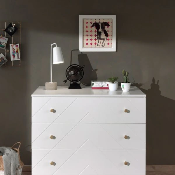 De Vipack Billy Commode Wit is gemaakt van hoogwaardig materiaal. De commode beschikt over 3 lades met voldoende opbergruimte. Dankzij de eenvoudige vormen en kleuren is de Vipack Billy Commode geschikt voor in elke kamer. De diagonale strepen en de gouden handgreepjes en pootjes zijn kenmerkend voor de Billy collectie. De commode is perfect te combineren met andere producten van de Billy collectie.