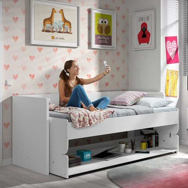 Het Vipack Denver Bureaubed Wit 90 x 200 cm is multifunctioneel daar het een bureau en bed inéén is. Overdag is het te gebruiken als bureau om aan te studeren of te spelen en ’s nachts kan het kind hier in slapen. Hiermee bespaar je ruimte en haal je in één klap een bureau en bed in huis. Natuurlijk ideaal als je ruimte wilt besparen. Wil je het bureau in de avond omzetten naar het bed? De studieboeken en laptop kan je gewoon op het bureaublad laten liggen en het ombouwen is in een handomdraai gedaan. Het Vipack Denver Bureaubed kan op zichzelf los staan en hoeft dus niet aan een wand gemonteerd te worden. Het bureaubed wordt geleverd inclusief lattenbodem en exclusief matras.