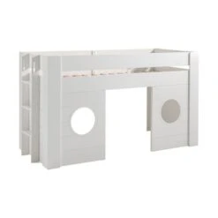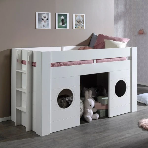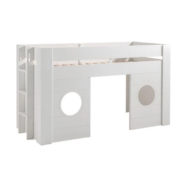 De Vipack Noah Halfhoogslaper Wit 90 x 200 cm is een mooi en kwalitatief en hoog bed wat is vervaardigd van MDF. Aan de achterzijde bevind er een trap zodat er eenvoudig op het bed geklommen kan worden. Bovenin de trap bevinden twee handgrepen zodat het goed vastgepakt kan worden. Onder het bed bevind er een ruimte waar spullen opgeborgen kunnen worden maar wat ook als speelplek gebruikt kan worden. Deze ruimte beschikt over een grote opening met aan beide zijkanten een rond raam in het paneel. Eigenschappen